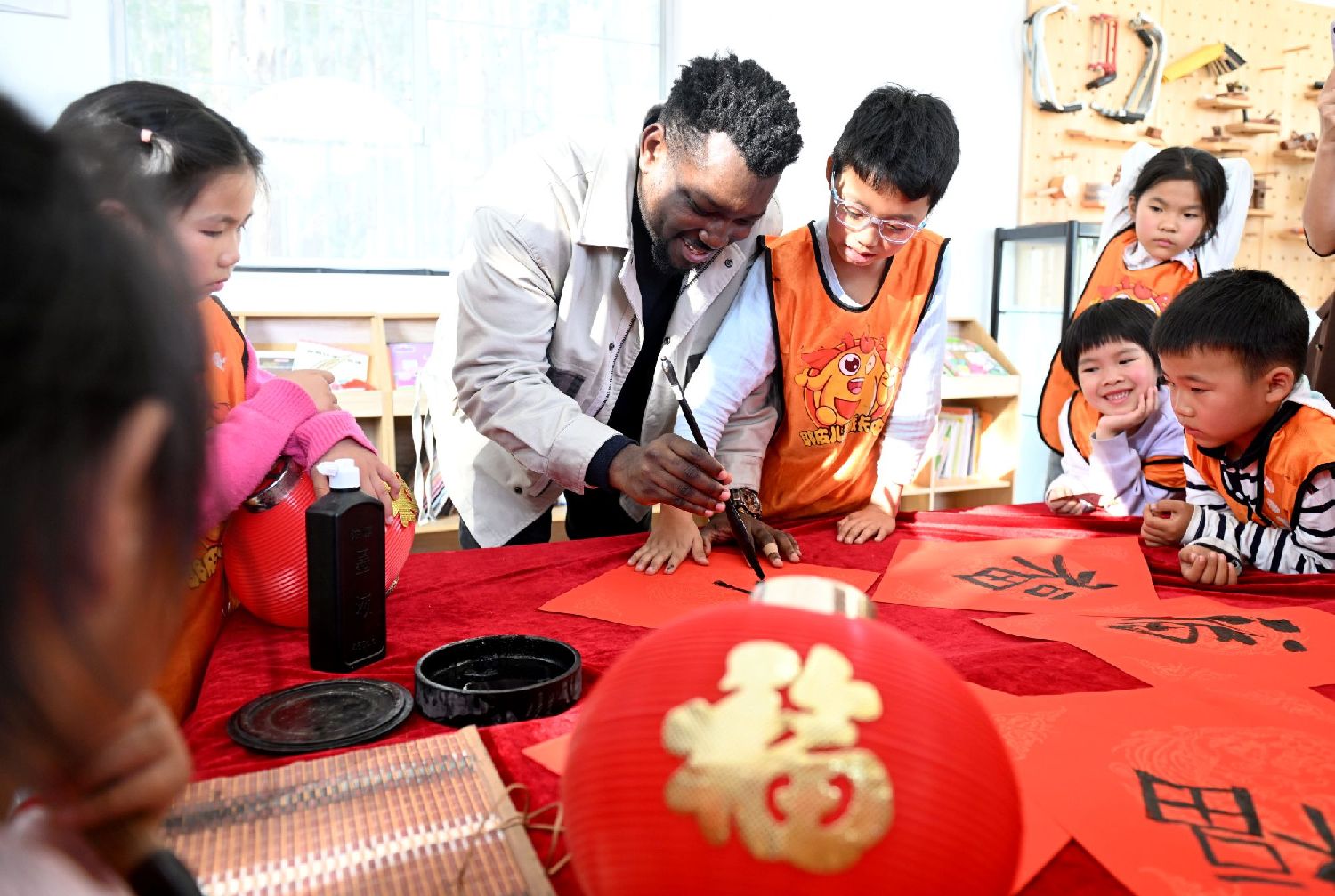 “‘福’代表好运和幸福,我喜欢这个字的寓意。”他一边写一边向孩子们解释。他铺开红纸,握起毛笔,和孩子们一起写“福”“马”“春”等字。孩子们兴奋地围上来,与老师共同完成了一幅幅充满童趣的“福”字作品。