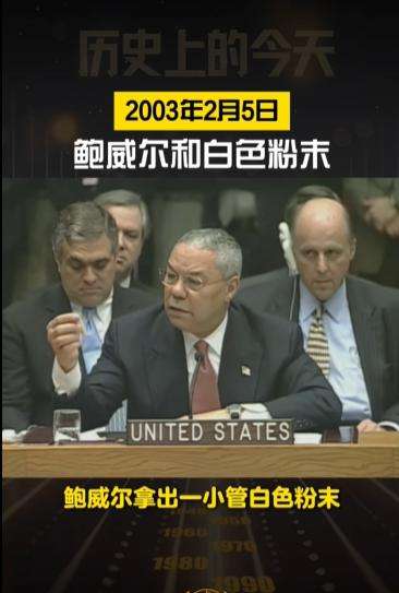 这段约40秒的视频简短回顾了,2003年2月5日时任美国国务卿鲍威尔在联合国安理会上的发言,其以白色粉末为“证据”指控伊拉克拥有大规模杀伤性武器,并直接导致一个半月后伊拉克战争的爆发。