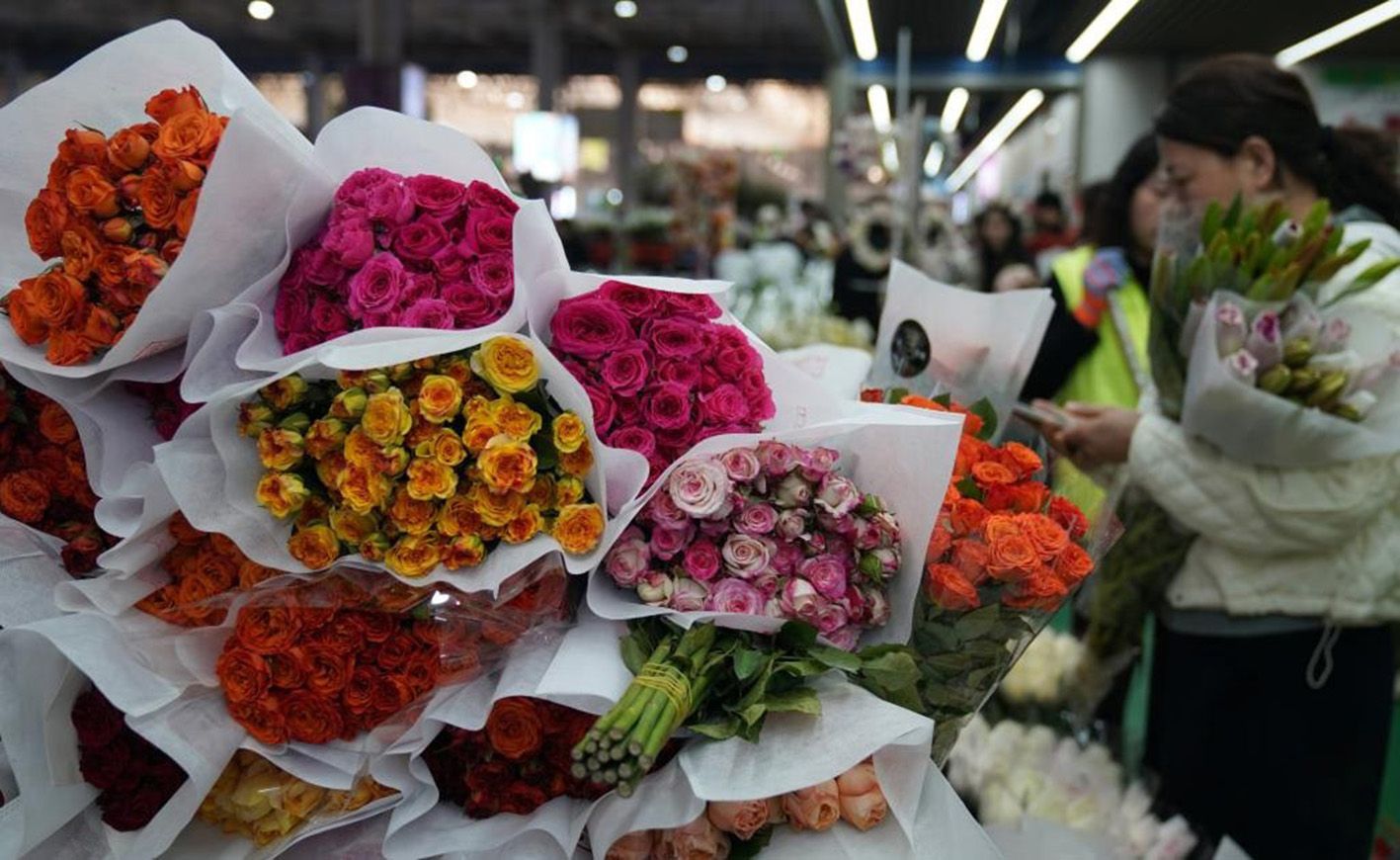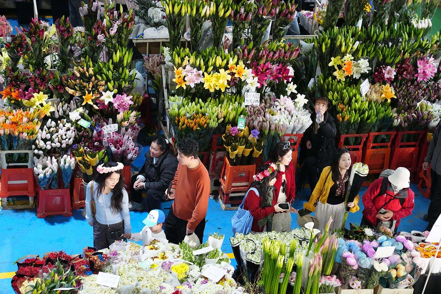 2月4日,随着春节临近,昆明斗南迎来年宵花销售高峰期。图为民众在昆明斗南花市购买鲜花。(中新社)