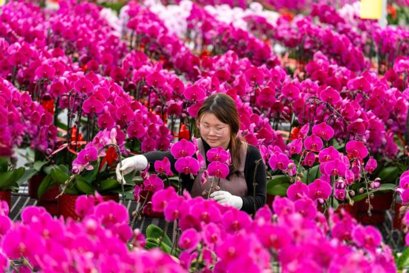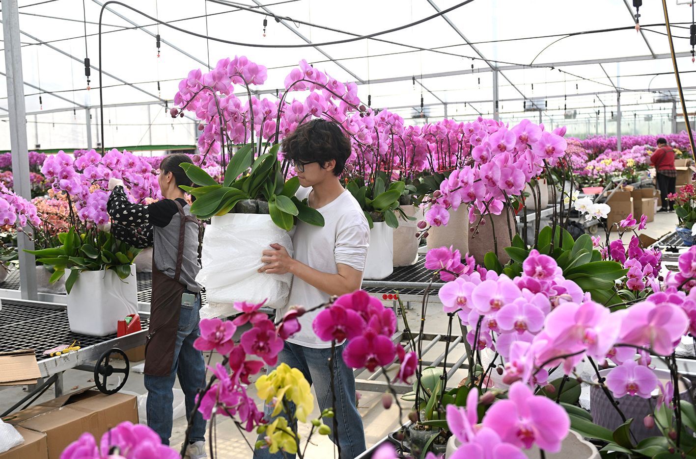 2月4日,福建漳浦,漳州森美园林绿化有限公司温室大棚内,工作人员正进行蝴蝶兰的组盆、打包,赶制春节订单。新春临近,福建漳浦台湾农民创业园的蝴蝶兰进入年度销售旺季。园区内,各色蝴蝶兰竞相绽放,花姿优雅、品种丰富,成为年宵花市场热门选择。(中新社)