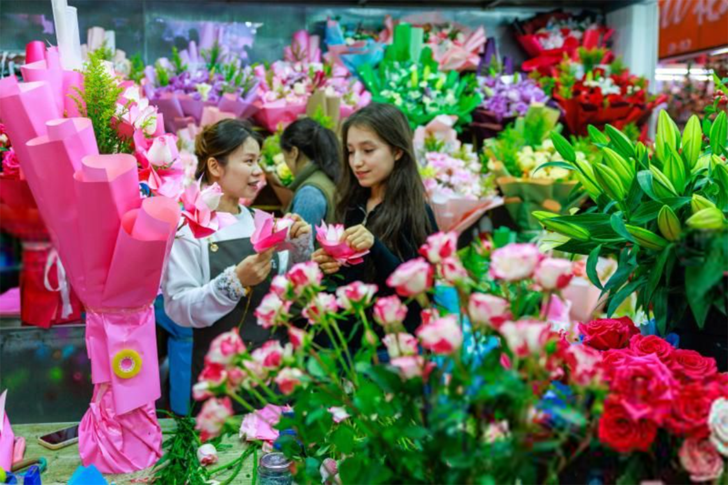 近日,新疆乌鲁木齐市天山区南园花卉鱼鸟市场,花艺师正在包装鲜花。春节临近,乌鲁木齐市各大花卉市场持续升温,各类年宵花竞相绽放,吸引了众多市民前去选购。(中新社)