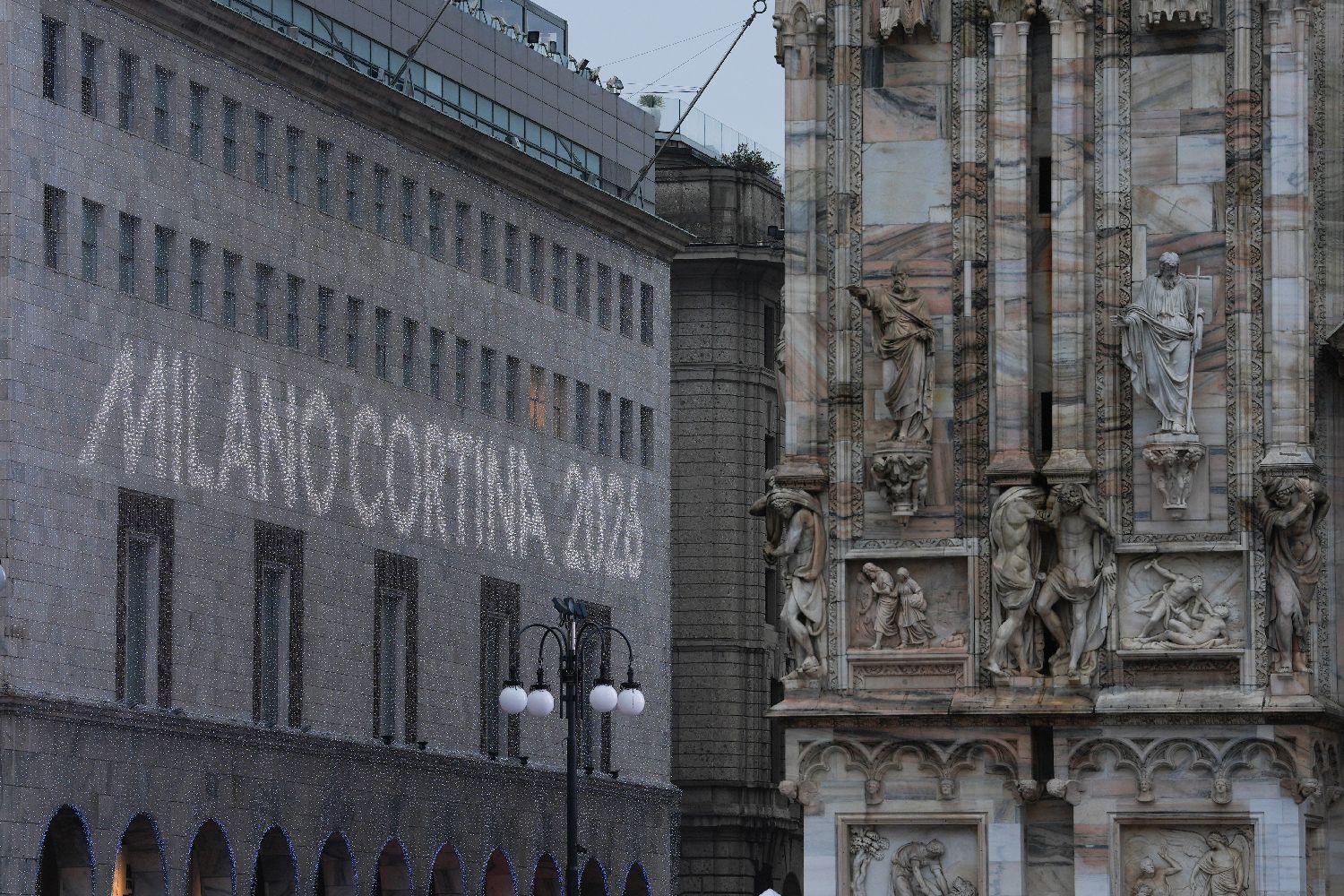 2月4日,“MILANO CORTINA 2026”字样被投影在米兰大教堂旁的建筑物上。(中新网)
