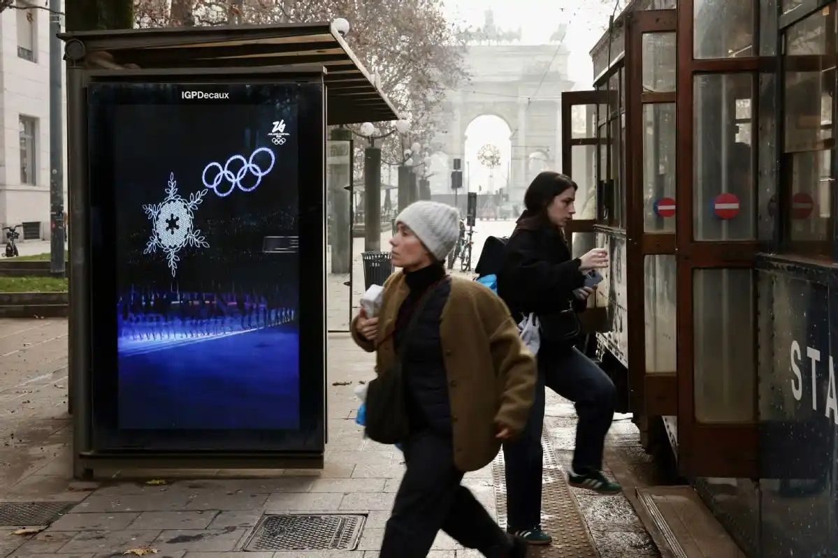 2月5日,米兰街头车站,大屏幕上展示的北京冬奥会画面。(北京《中国日报》)