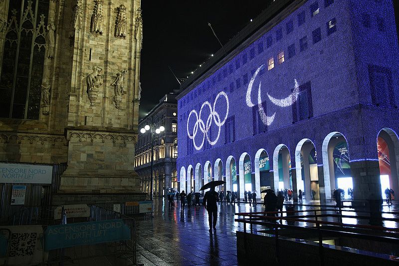 图为冬奥会标志在夜晚被投影在米兰大教堂旁的建筑物上。(CFP)
