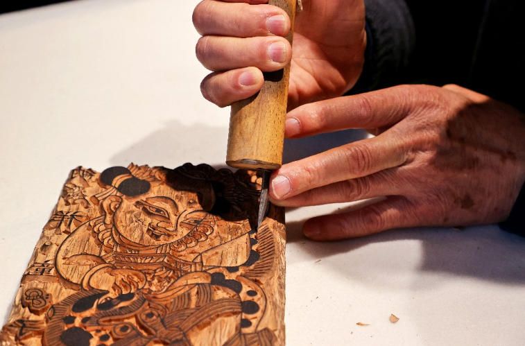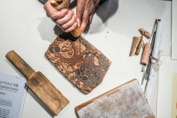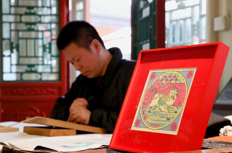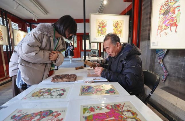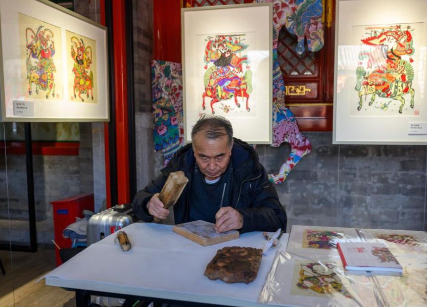 2月4日,国家级非物质文化遗产项目凤翔木版年画代表性传承人邰立平在展览现场雕版。(新华社)