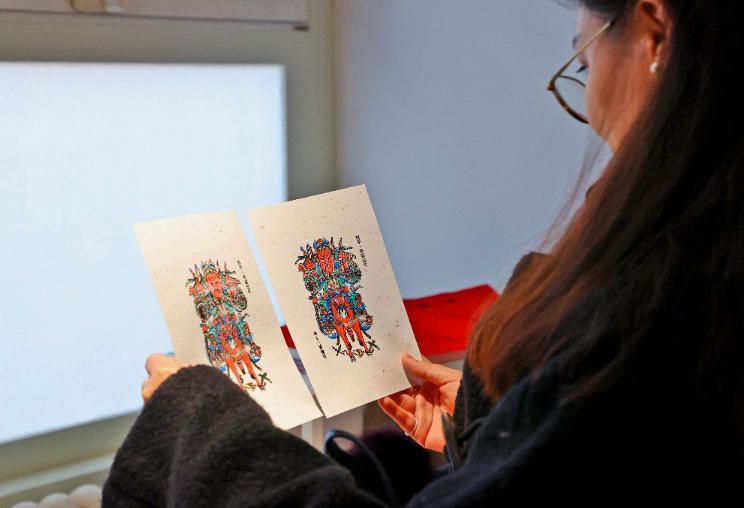 2月4日,中国国家级非物质文化遗产项目凤翔木版年画代表性传承人邰立平(右)展示木版年画制作流程。(北京《中国日报》)