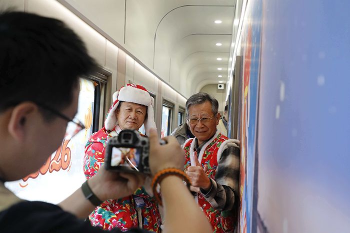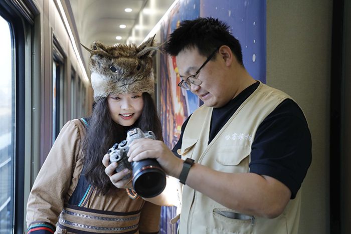 “衣服随便穿,前面还有背景墙。”顺着列车员指引的方向,可见冰雪大世界、中央大街、雪乡木屋等背景布装点的车厢,与窗外的冰雪美景交相映衬。