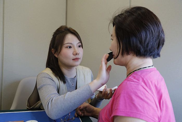 2月4日,哈尔滨前往亚布力的“银旅号”旅拍专列开行,列车长苏瑞琪为台湾旅客化妆。(图/中新社)