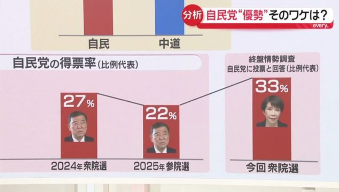 分析指出,自民党在终盘阶段显现“异常强势”,连党内候选人也对高胜算缺乏直观感受。其关键原因之一,在于高市早苗出任党首后,自民党支持率明显回升。调查显示,本次比例代表中选择“投自民党”的比例约为33%,显著高于2024年衆议院选举和随后参议院选举时的水平,接近2021年岸田政府时期的高点。
