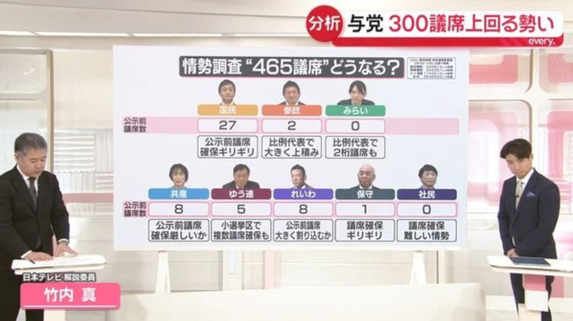 与之形成对比的是,中道阵营在整合后未能实现“加法效应”,比例代表支持率远低于原本预期,导致双方差距拉大。此外,小选举区制度“胜者通吃”的结构性特点,也进一步放大了支持率差距,使自民党在接近五五开的选区中更容易转化为议席优势。综合来看,自民党支持回暖、在野分散及选制因素叠加,构成了执政党在终盘阶段占据明显上风的主要背景。(文中图片来自日本电视台NNN节目)