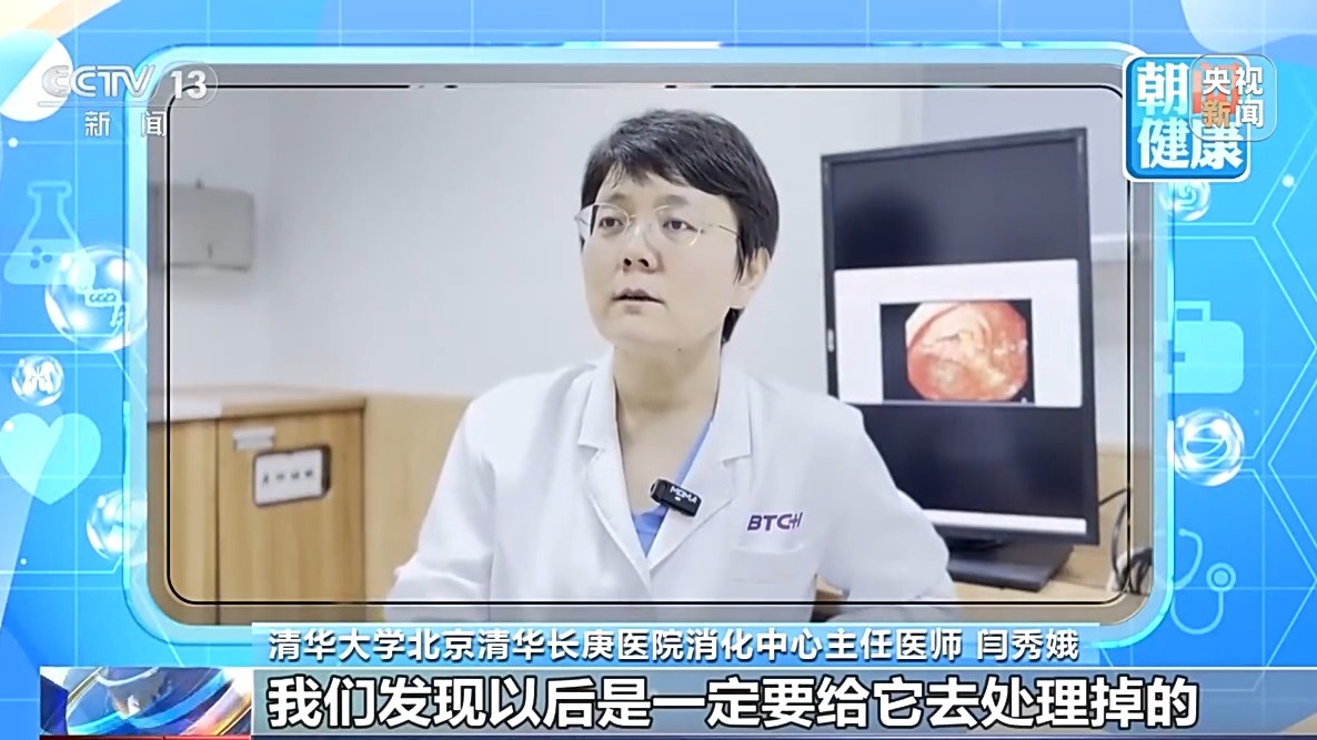 清华大学北京清华长庚医院消化中心主任医师闫秀娥:像腺瘤性息肉,我们发现以后一定要给它处理掉,如果不处理它,经过5年或者10年,它必然要发展成癌。还有一部分息肉是良性息肉,比如胃里的增生性息肉,它可能经过10年以后它也不一定会癌变,但是这部分息肉也是要处理的,随着时间的推移,息肉会长大,长大以后它的血供越来越丰富,可能会引起消化道出血。