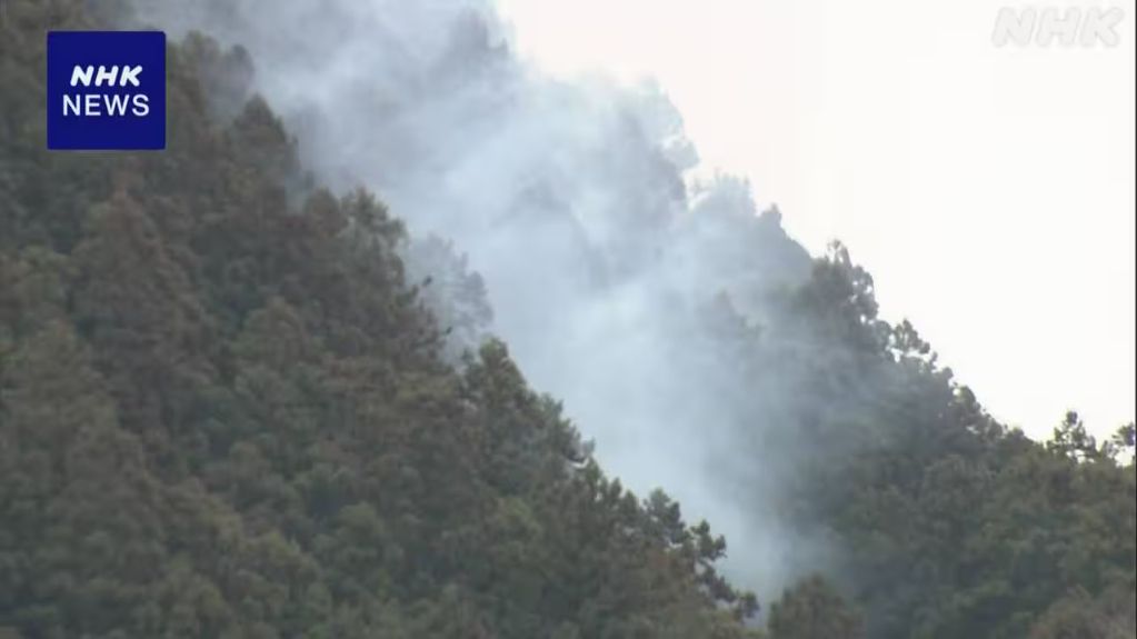 日本埼玉县秩父市山林火灾持续 恶劣天气导致直升机灭火中断