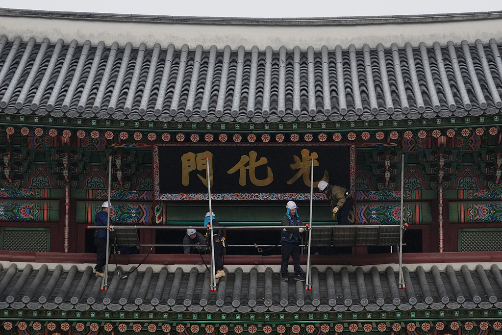 2025年12月16日,韩国首尔,工人们在景福宫正门光化门搭建脚手架并检查招牌。(视觉中国)