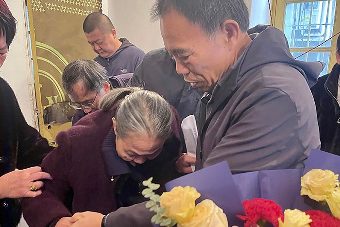2月7日,台胞刘德文(右一)将福州籍隐蔽战线烈士林祥熹的骨灰坛从台湾送回福建福州。图为林祥熹烈士的妹妹林祥仪向刘德文致谢。(图/中新社)