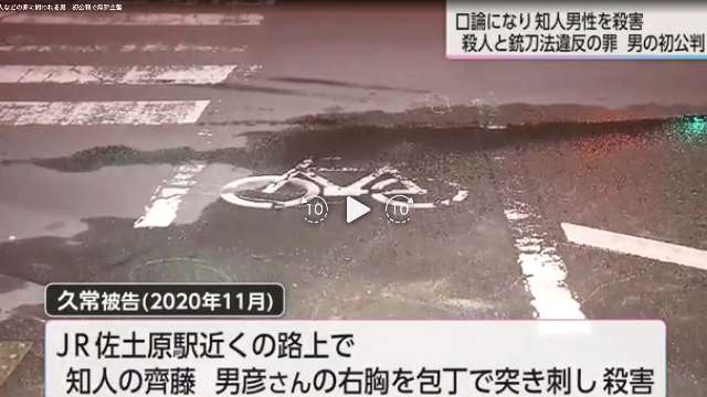据检方起诉书及相关材料显示,被告人为居住在日本宫崎县宫崎市佐土原町、从事建筑行业的久常芳治,现年52岁。检方指控称,2020年11月,久常芳治在位于宫崎县宫崎市、靠近JR佐土原站的道路上,使用刀具刺向一名男性熟人的右胸部,导致对方死亡。被害人系齐藤男彦,案发时47岁。检方因此以杀人罪及违反刀具管理相关法律对久常芳治提起公诉。