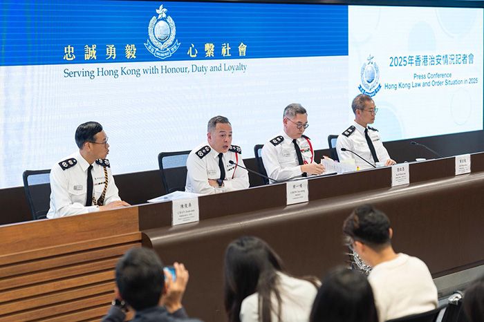2月11日,香港特区政府警务处举行记者会,回顾2025年香港的治安情况及警务工作。(图/香港特区政府新闻处)