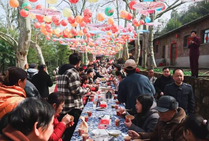 中午时分,由莲花镇全部12个村(社区)各派厨师,以本村特色食材烹制一道代表性主菜组成的“莲花十二村宴”开席,近千名预约成功的市民游客与本地村民、新就业群体代表等分五轮依次入席,品尝着从龙洞村腊味合蒸到其他各村山野风味的“一村一品”。