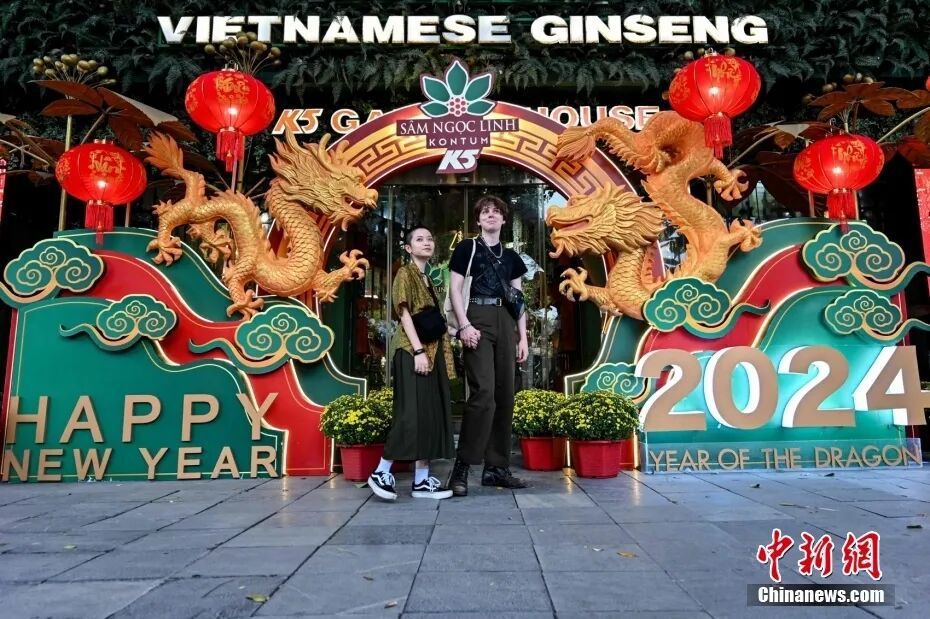 资料图:当地时间2024年2月6日,越南河内,一对夫妇在庆祝中国农历龙年春节的龙形装置前摆姿势拍照。