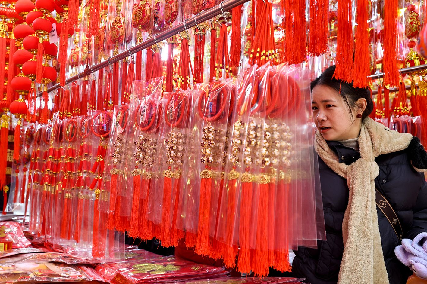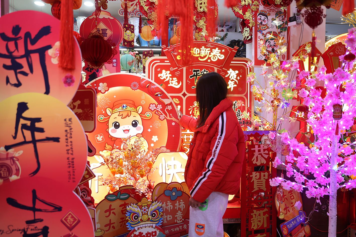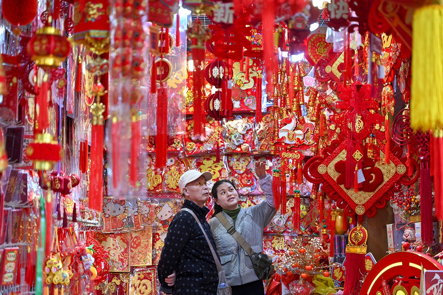 近日,湖北武汉,市民在选购春节饰品。随着丙午马年春节临近,武汉汉正街小商品市场里春联、年画、福字、马元素装饰品等琳琅满目,吸引民众前来选购。(中新社)