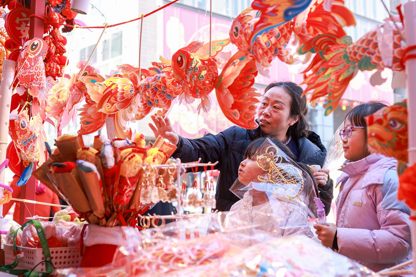 2月12日,家长带着小朋友挑选鱼灯。临近春节,北京隆福寺新春市集上市民游客络绎不绝,超30家老字号扎堆亮相,各式马年新春特色产品琳琅满目。(中新社)
