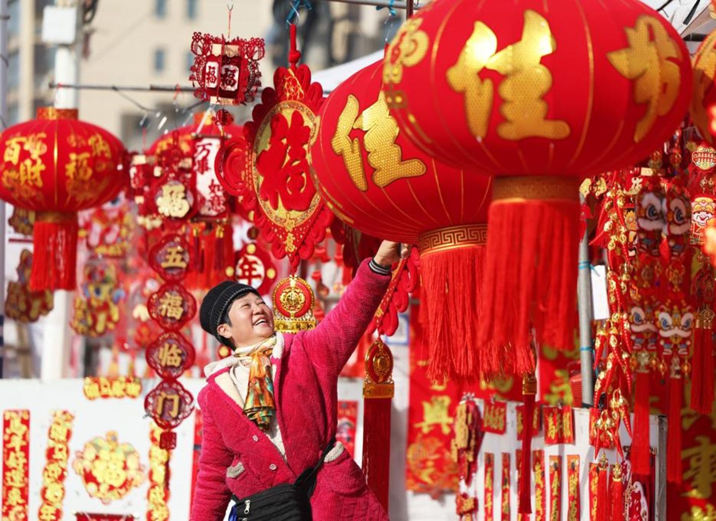 春节将至,中国各地年货市场中,吉祥的春联、火红的灯笼、精美的挂件及可爱的马年玩偶等春节饰品,已成为市民购物篮中的主角,随处可见人们手提大包小裹、满面笑容地采购节庆饰品和年货,迎接新春佳节的到来。