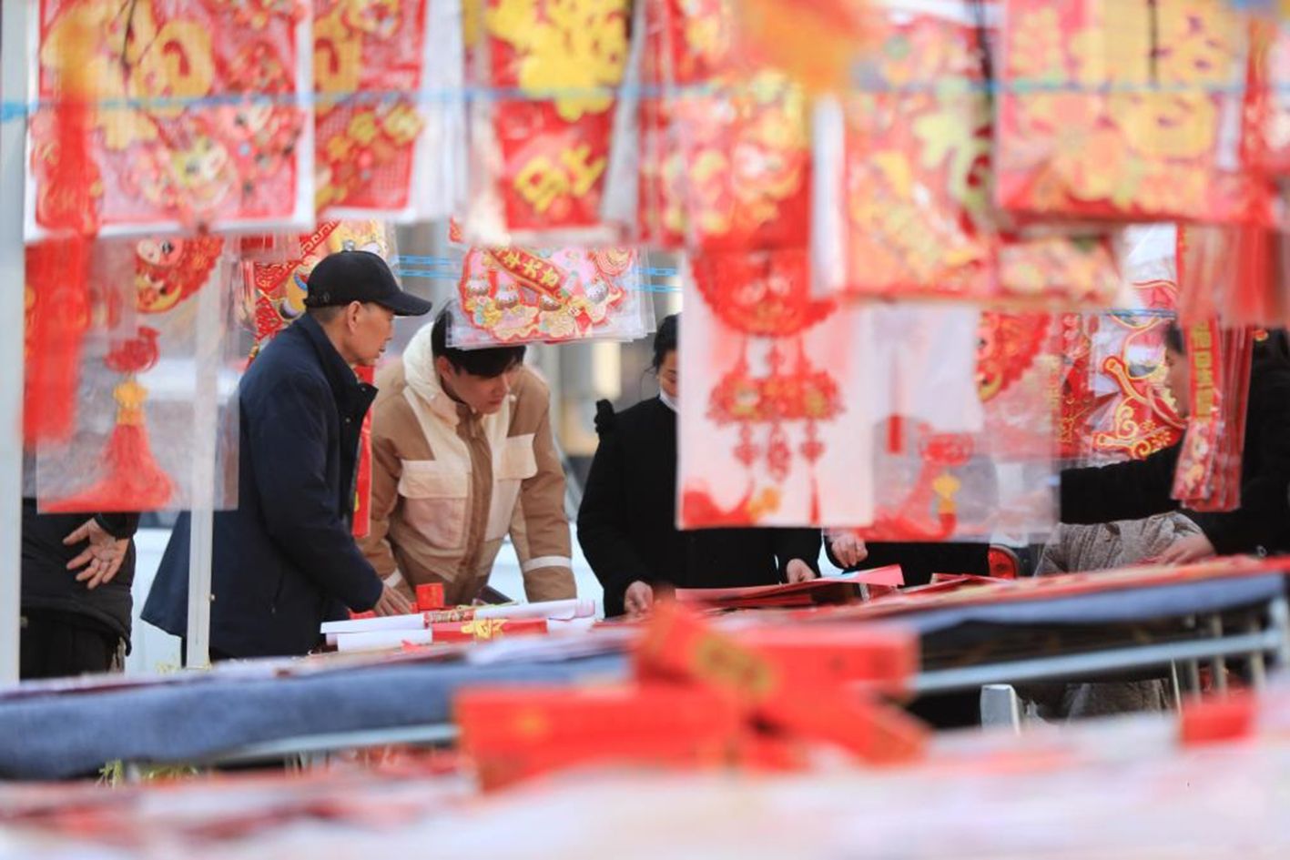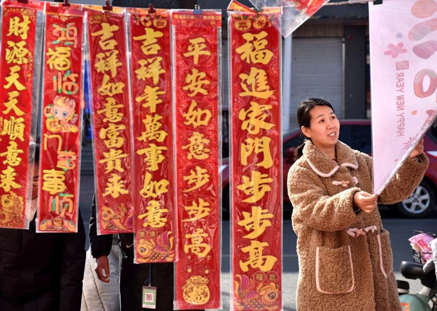 2月12日,人们在河南省焦作市温县的一处集市上选购春联。(新华社)