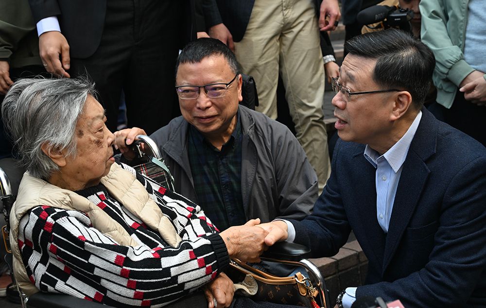 13日,香港特区行政长官李家超(右一)慰问长者。(图/中新社)