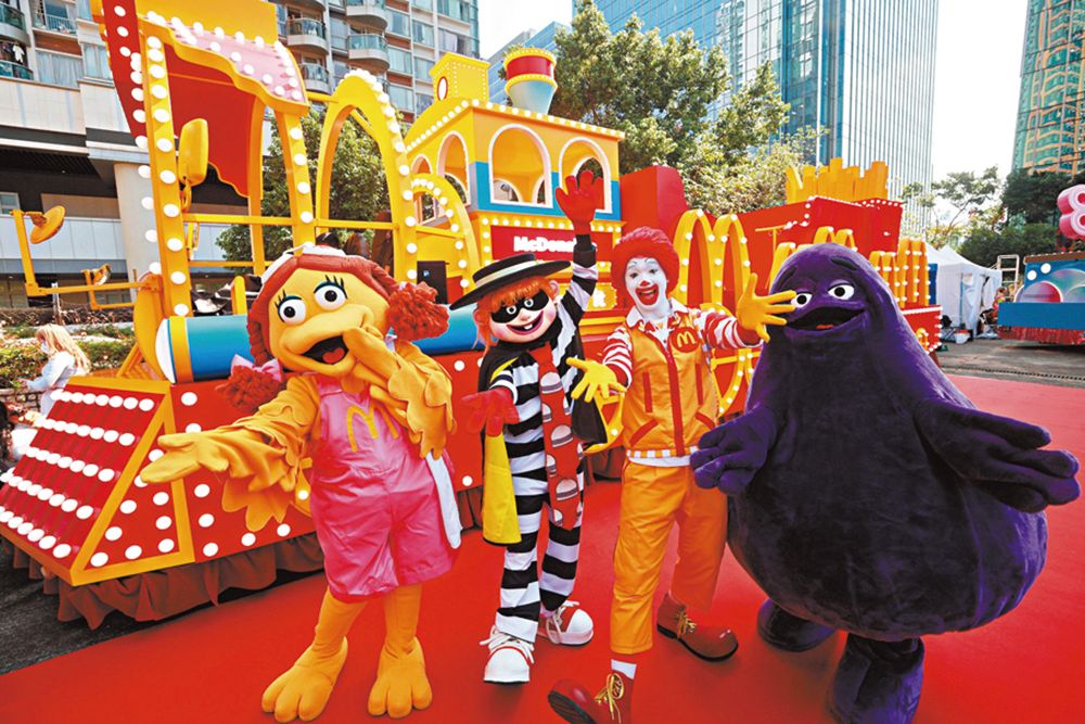 香港麦当劳首次参加花车巡游,经典角色麦当劳叔叔以及汉堡神偷等亦随车展示。(图/香港《文汇报》)