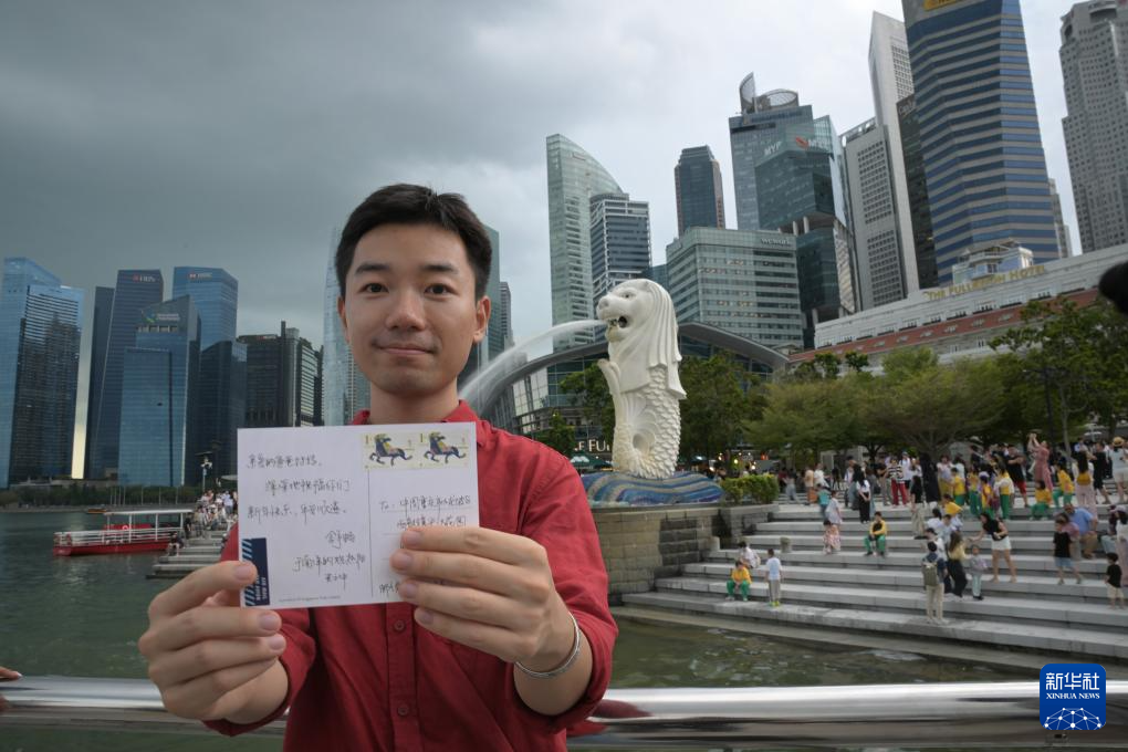 2月6日,在新加坡鱼尾狮公园,新华社记者舒畅手举写给父母的明信片,上面贴有马年邮票。新华社发(邓智炜摄)