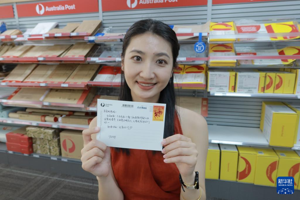2月4日,在澳大利亚堪培拉,新华社记者王佳琳手举写给远方父母的明信片,上面贴有马年邮票。新华社记者王佳琳摄