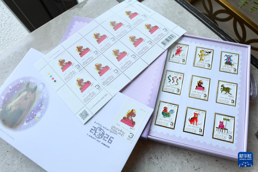 这是2月5日在泰国曼谷邮政总局拍摄的马年纪念邮票、首日封以及诗琳通公主绘制的十二生肖邮票图案徽章纪念品。新华社记者孙玮彤摄