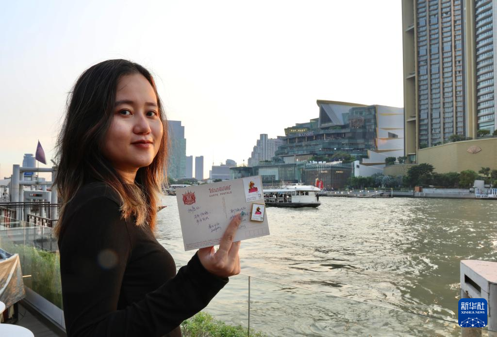 2月5日,在泰国曼谷湄南河畔,新华社记者孙玮彤手举写给同事们的明信片,上面贴有马年邮票。新华社发(张纯颖摄)