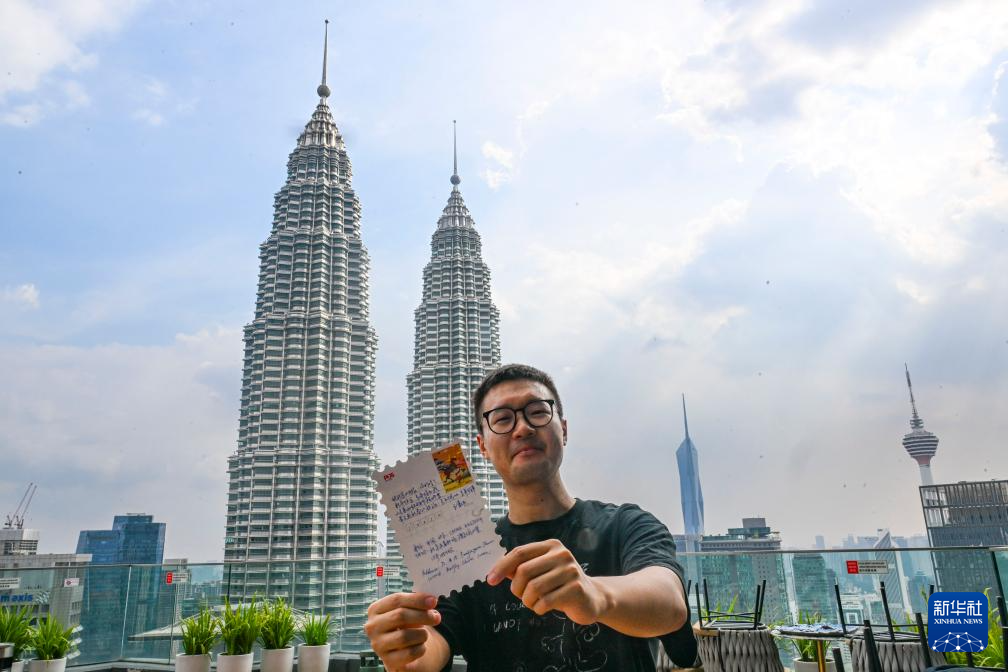 2月5日,在马来西亚吉隆坡,新华社记者王嘉伟手举写给朋友的明信片,上面贴有马年邮票。新华社记者程一恒摄