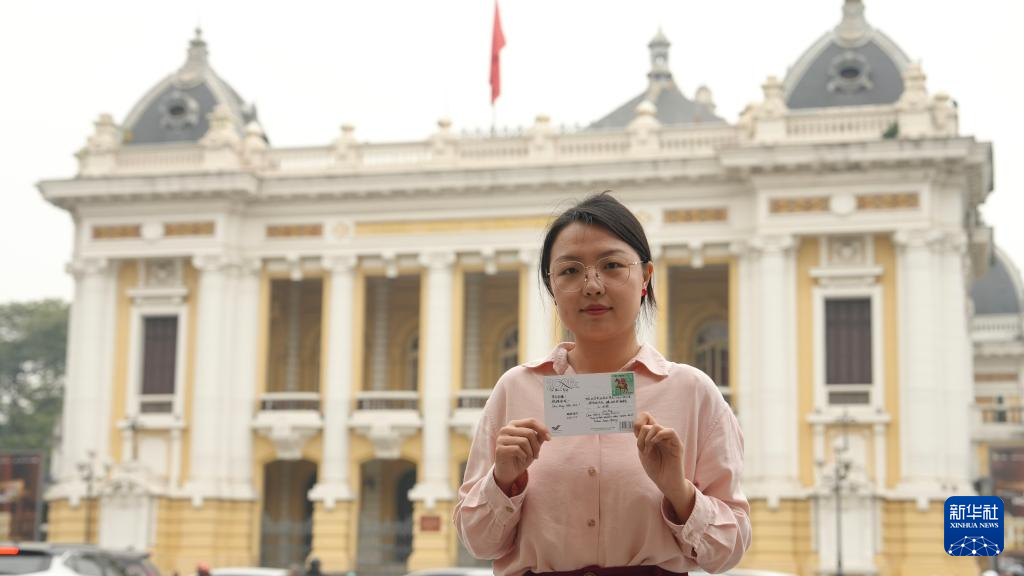 2月4日,在越南河内,新华社记者刘颍手举写给自己的明信片,上面贴有马年邮票。新华社发(阮芳银摄)