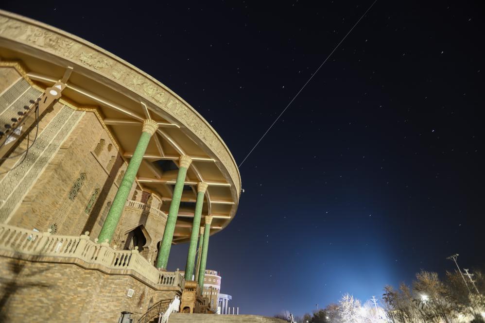 2022年12月28日,在新疆哈密拍摄的中国空间站飞过哈密木卡姆传承中心。新华社发(王俊峰摄)