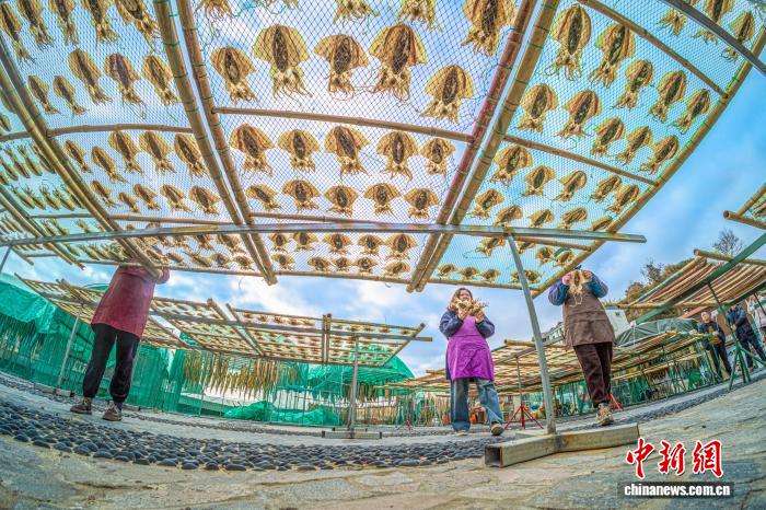 连日来,温州沿海地区的渔民们趁着晴好天气,将新鲜海产赶制成风味独特的鱼鲞。广场边、庭院里、屋顶上,一排排晒架整齐铺开,鳗鱼、带鱼、墨鱼等在冬日暖阳下泛着光泽,飘散出独特的咸鲜气息。