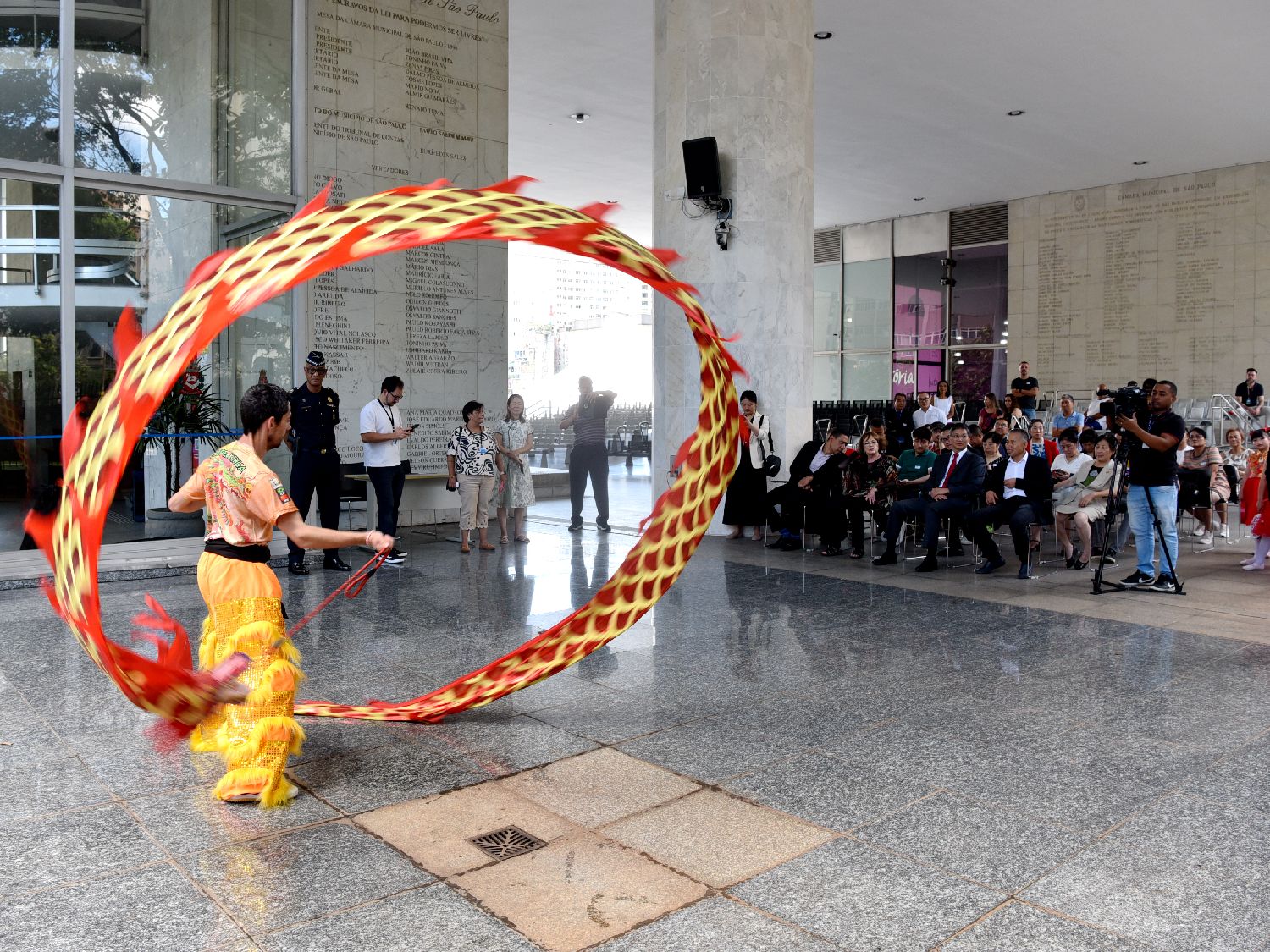 当地时间2月13日,巴西圣保罗,圣保罗市议会举行升旗仪式庆祝马年春节。图为仪式现场巴西龙狮团表演彩带龙。(图/中新社)