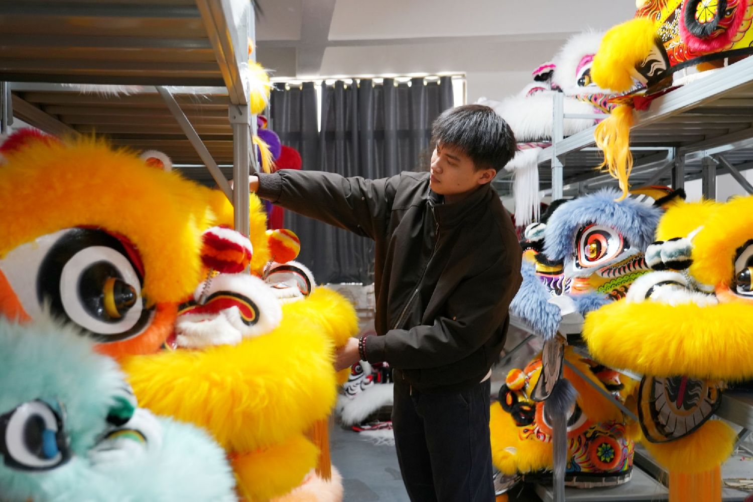 唐楚凡说,团队成员都懂舞狮,在制作狮头时不仅贴合现代舞狮表演和竞技需求,还融入地方特色文化,加入很多“潮”元素,推出了各种“多巴胺配色”狮头。团队自研荧光颜料,让狮头在夜间舞台熠熠生辉,颇受客户青睐。