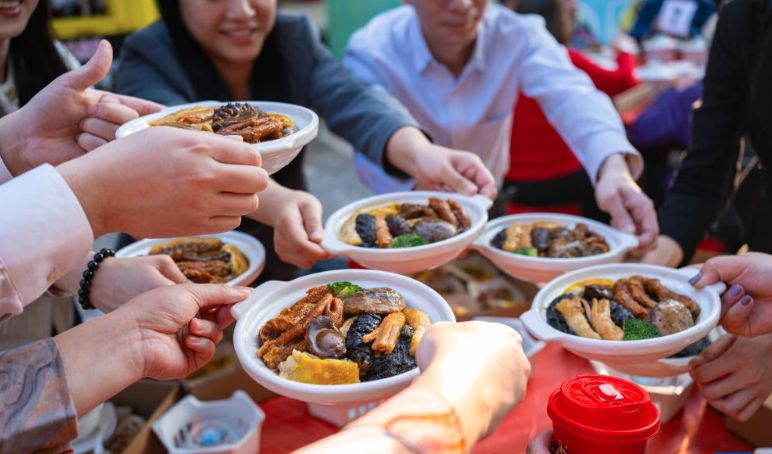 2月13日,市民在妈阁塘片区“迎新春盆菜宴”上品尝美食。(图/新华社)