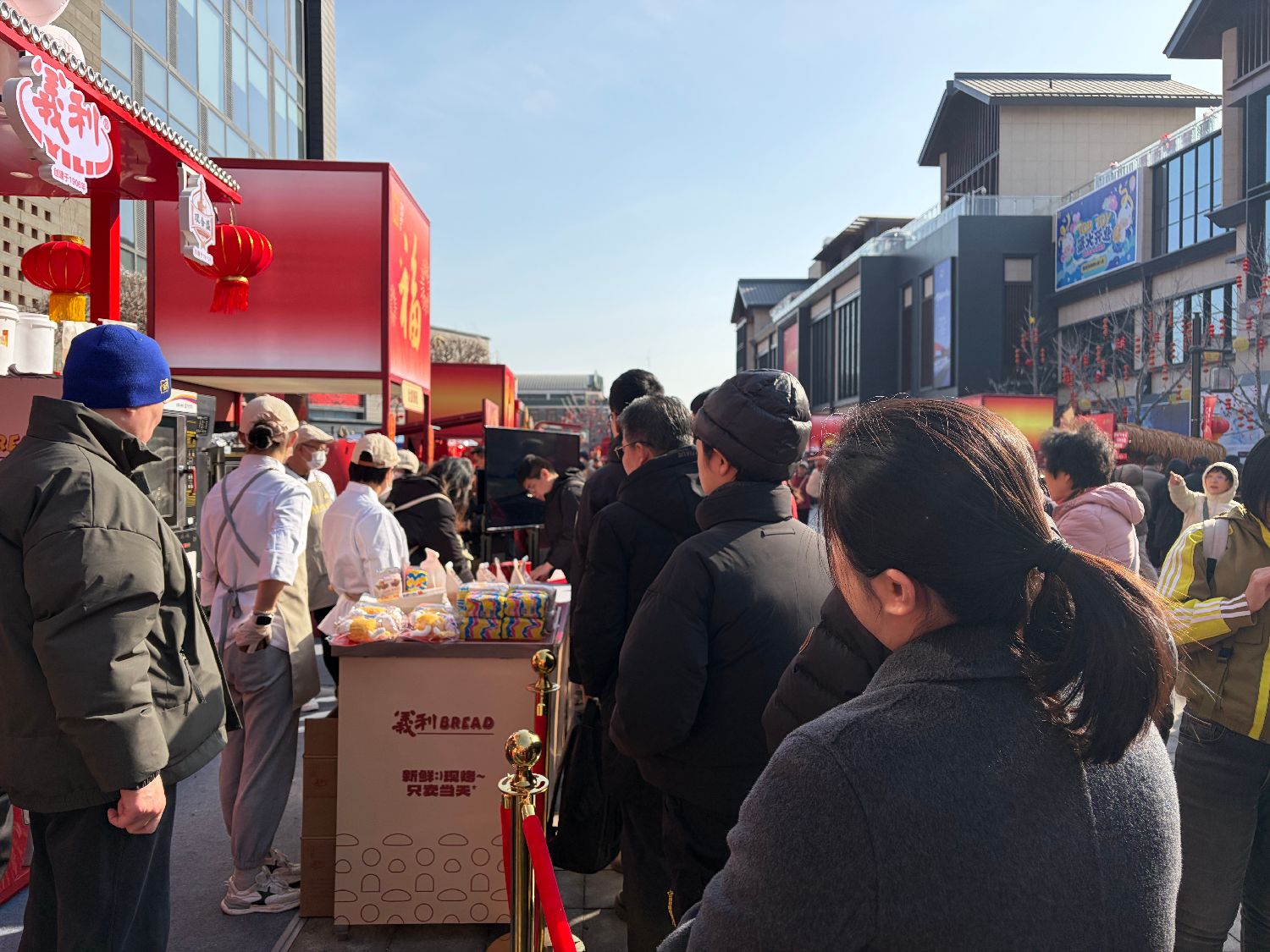中国农历丙午马年春节的脚步越来越近,家家户户进入置办年货“环节”。在中国人年货清单的“变”与“不变”中,展现出人们对生活方式与品质的追求。稻香村、张一元、天福号、六必居等中国传统老字号店铺里排起长队。这些年,人们对“老味道”的热爱不曾改变。义利这个具有北京地域特色的老字号品牌,陪伴许多人成长。图为2月14日,北京隆福寺新春市集的义利摊位,现烤面包吸引游客排起长长的选购队伍。(摄/林萧)