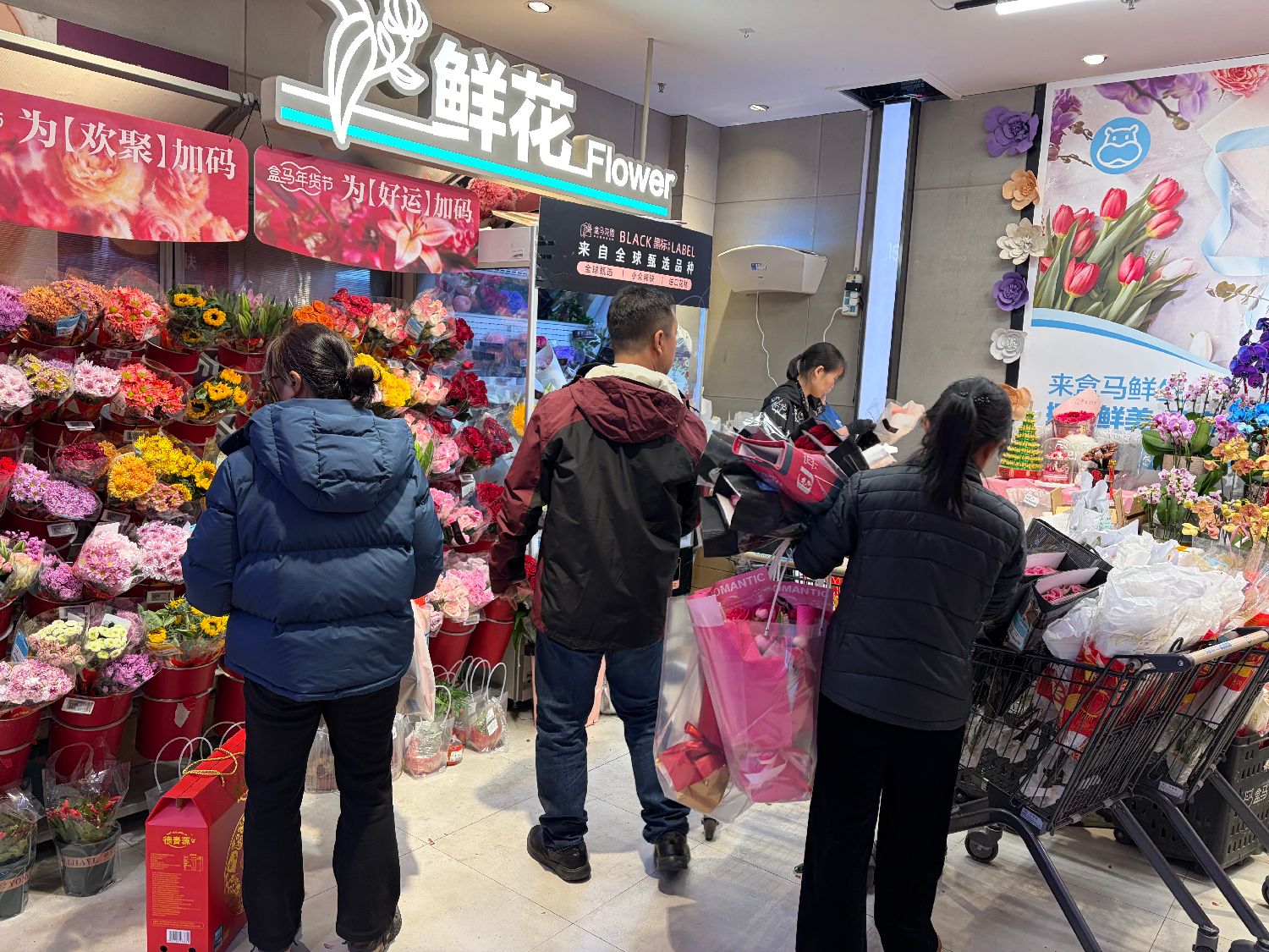 用鲜花装点家居,扮靓生活。随着人们对生活品质的追求越来越高,鲜花成为近年来节庆畅销商品。颜色鲜艳的玫瑰、蝴蝶兰等受到欢迎。图为2月14日情人节当天,北京一家“盒马”超市内,顾客选购鲜花。(摄/林萧)