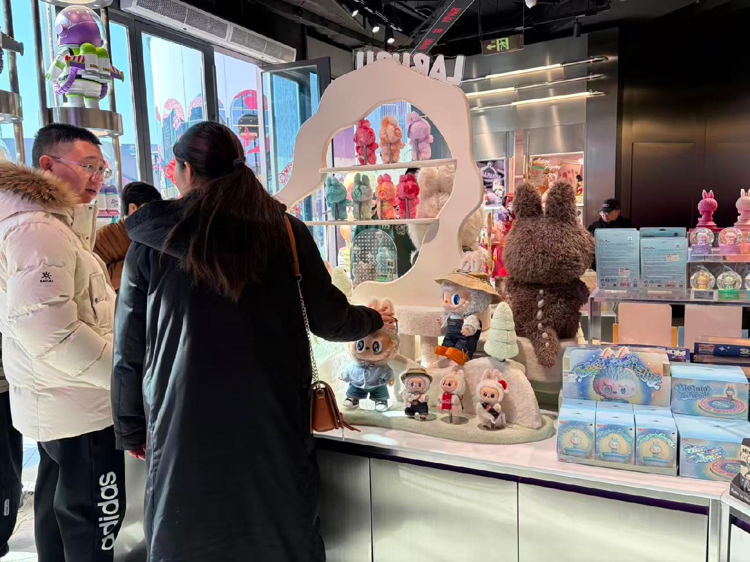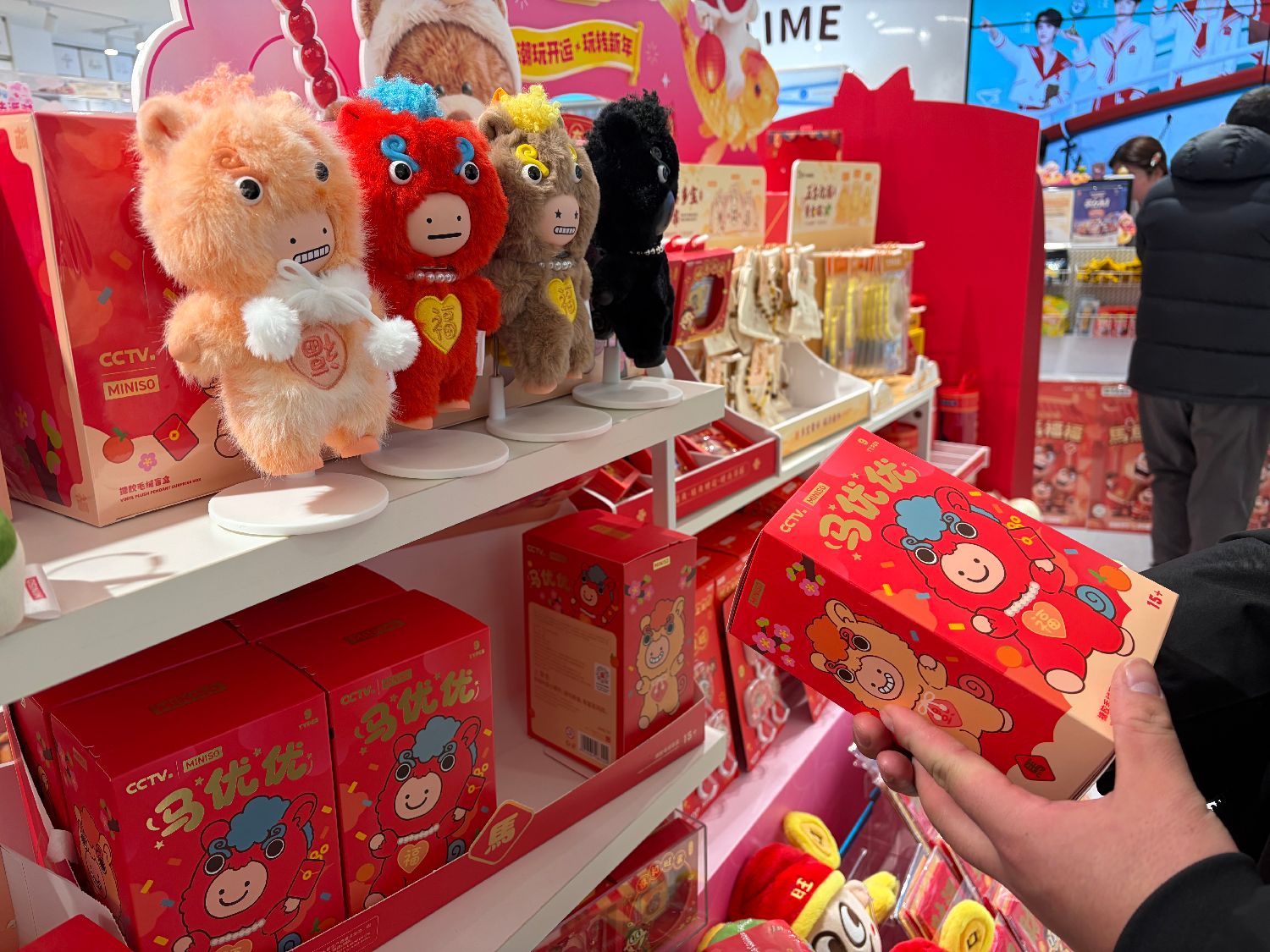 越来越多消费者愿意为情绪价值埋单,马年盲盒等文创产品拉动节前消费。 图为2月13日北京一家“名创优品”店内顾客正在选购盲盒。(摄/林萧)