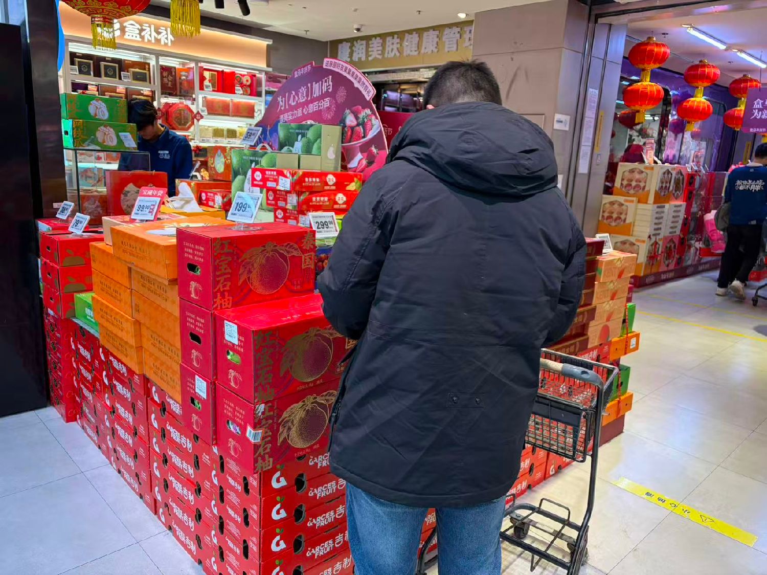 马来西亚榴莲、泰国龙眼、印尼山竹、越南红心火龙果……越来越多进口水果进入中国市场,也摆上中国人的春节餐桌。图为2月14日,北京一家“盒马”超市内,顾客选购泰国红宝石柚。(摄/林萧)