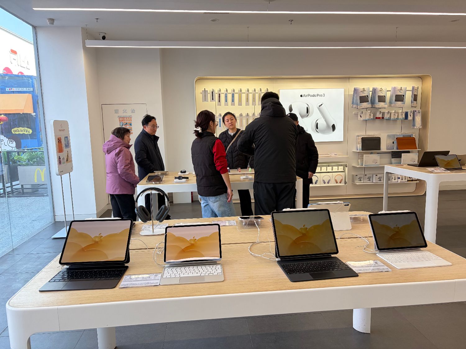 为家人朋友挑选一件电子产品作为春节礼物,也成为很多人的选择。图为北京一家苹果商店内,顾客正在挑选智能手表。(摄/林萧)