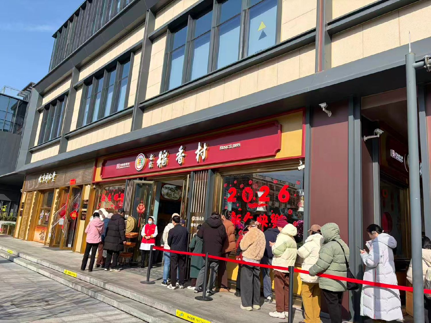 图为2月14日,北京稻香村(零号寻宝馆店)门前顾客排队等待进店采购。(摄/林萧)