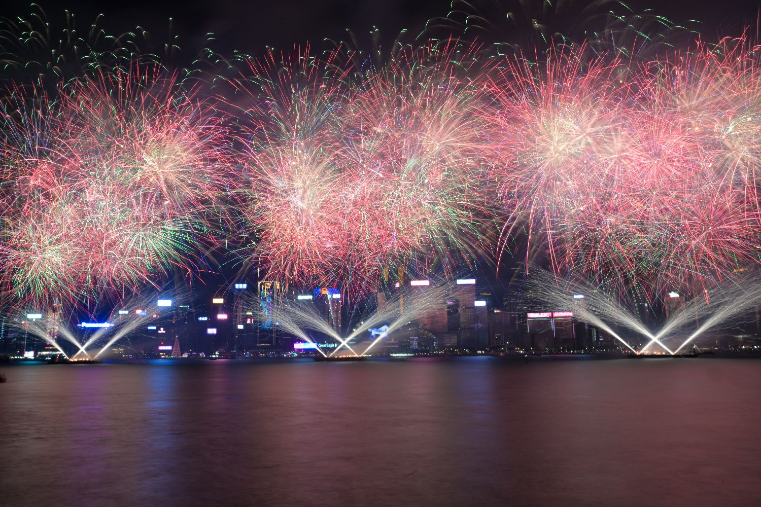 紧接而来的《共庆新春》,维港上空绽放出“8”字型图案与金灿灿的“金元宝”,将气氛“炒热”。《和谐愿景》则犹如星光般的礼花弹散落,照亮了维港两岸,现场欢呼声中多了几分感动与温情。