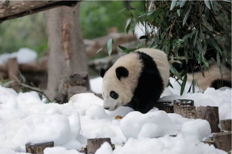 #超级马力 新春福利!成都熊猫基地为大熊猫“降雪”