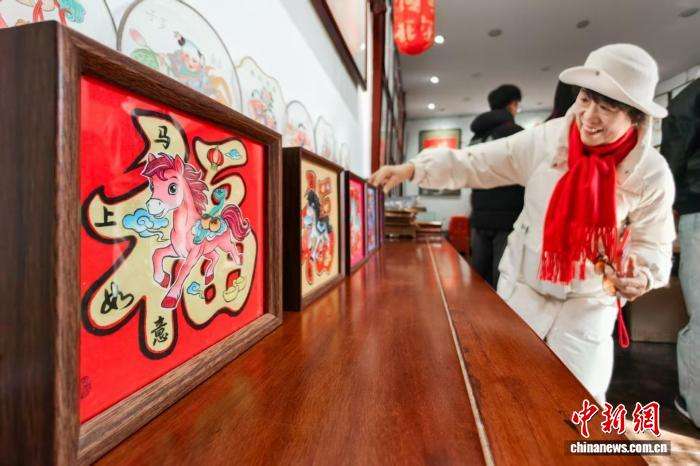 2月11日,天津杨柳青古镇,游客在“玉成号”画庄参观马年主题木版年画。中新社记者佟郁摄