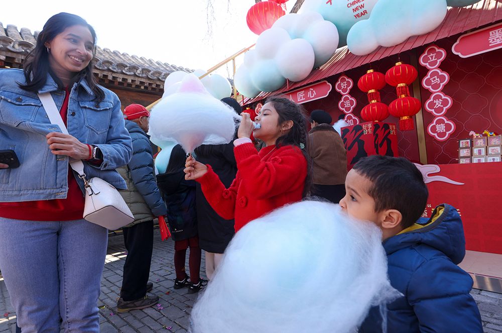 2月17日,农历正月初一,“会馆大开箱——2026前门东区新春非遗奇珍妙会”活动在北京前门东区三里河区域启幕。图为外国小朋友品尝棉花糖。(图/中新社)