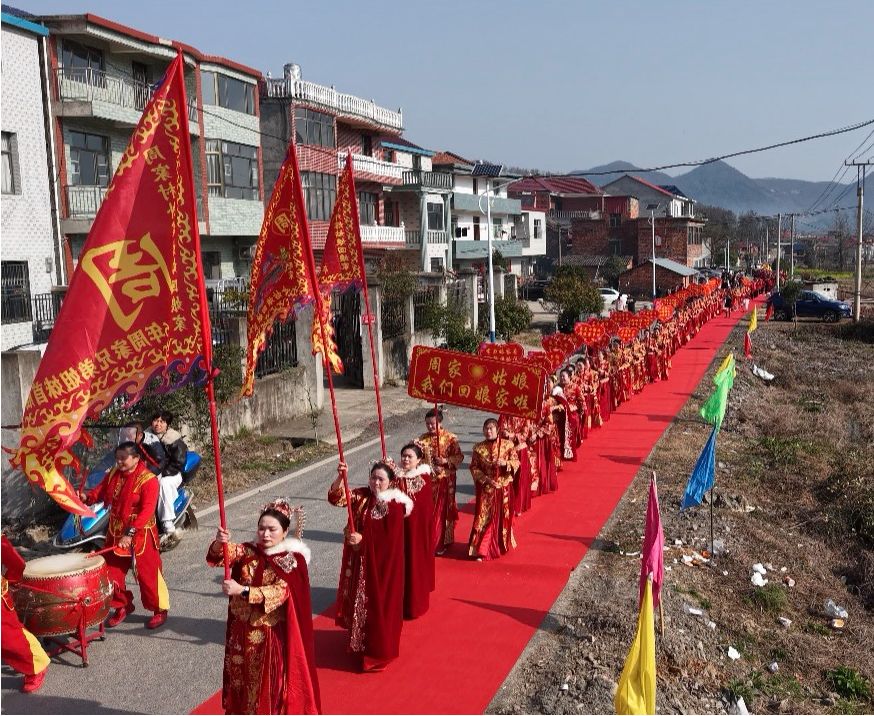 当地时间2月22日上午,湖北阳新县排市镇下桥村周氏文化礼堂前鞭炮齐鸣,锣鼓喧天,隆重迎接90位外嫁的姑娘集体回娘家。(图/武汉极目新闻)